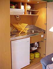 | The apartment lies in the extension to the home of the host family and has a separate access door. Originally built for private use, it is now available to you. Even though it measures only 28 m² (301 sqft.), you will not miss anything. You have your own modern bathroom with shower and window. There is space for 1-2 people. For single occupation the fold-away bed shown above in the picture can be used, for double occupation there is the convertible studio couch.. The small mini kitchen with cooker, fridge and sink, coffee machine and tableware is hidden in the left cabinet (see picture right).. There is a TV and a radio set, a small corner seating unit from where you can look out into the garden. Everything has been thought of.. At the entrance of your apartment there is a protected seating area with chairs, a sun shade and a Hollywood swing a nice place to be when the weather is fine, without being observed by the neighbours. You may sit there, perhaps with your hosts, for a little chat, for reading your book or to finish off the evening with a glass of wine or beer. In case the apartment is already occupied, the host provides in special cases an additional guest room that can be rented, for example when more than 2 people come or during the convention fair. Here you share the bathroom with the hosts. Prices available upon request. Pictures can be seen here: